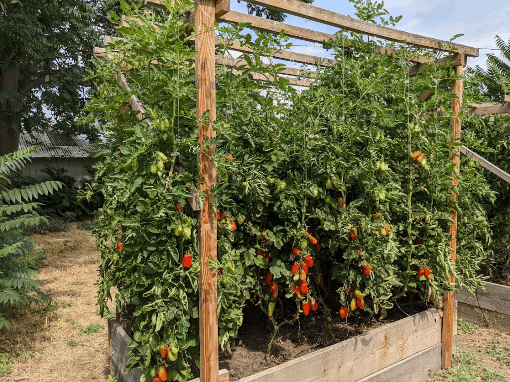 Tall San Marzano tomato plants supported by a wooden trellis with ripe and unripe fruits in a garden setting